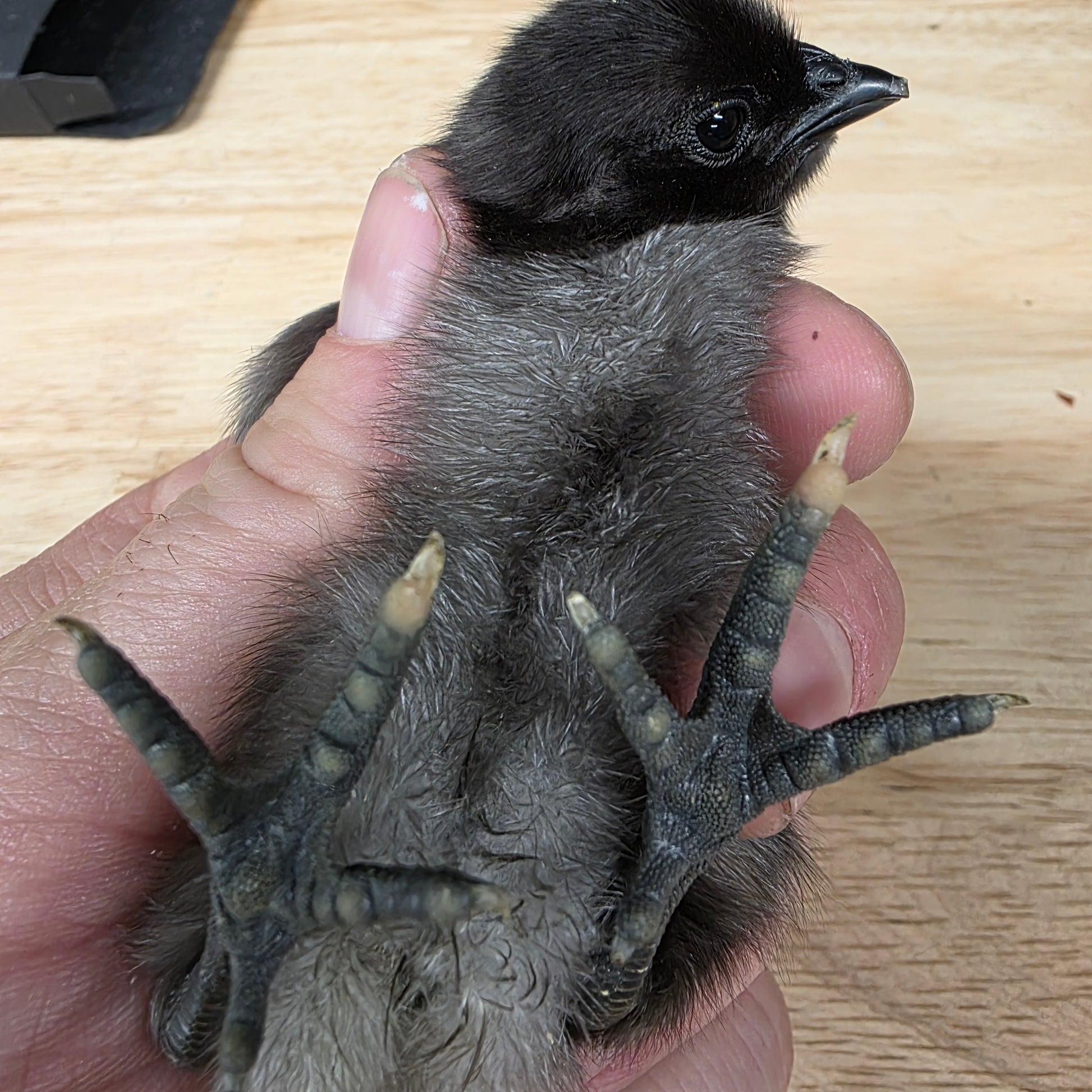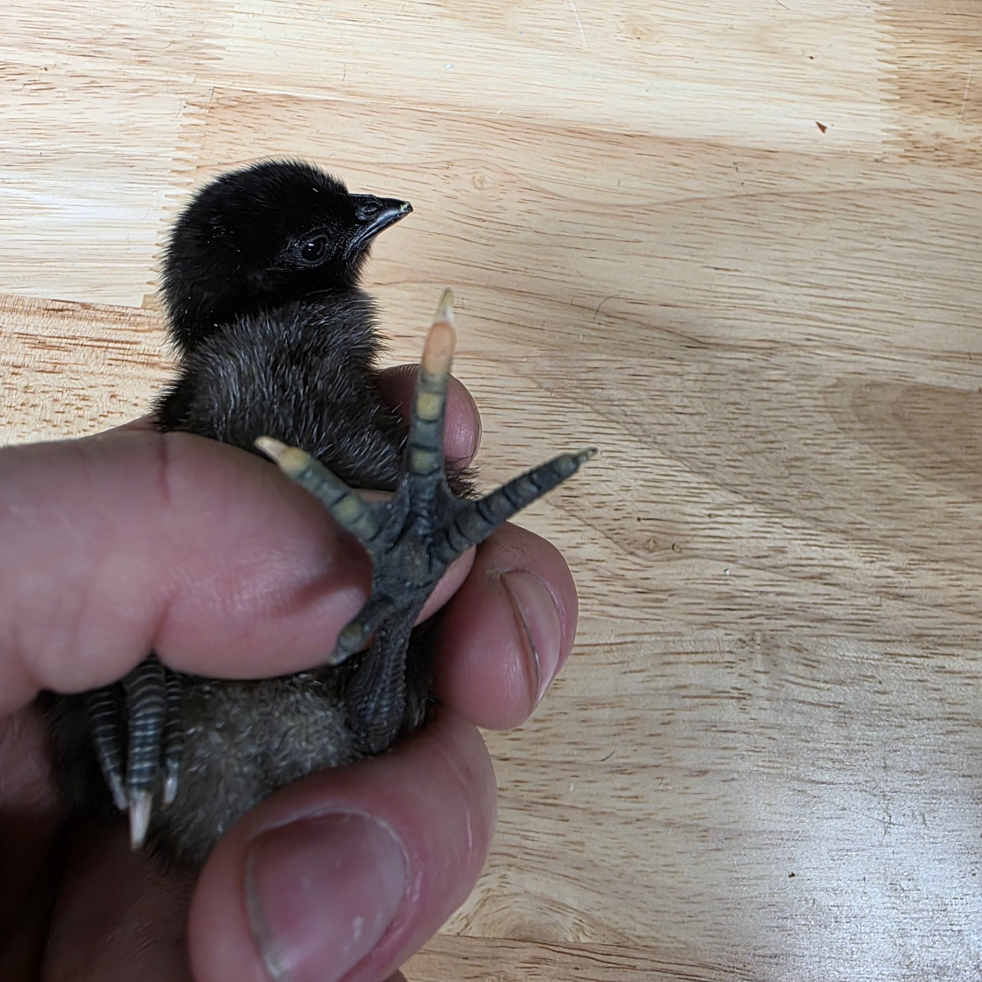 These are going to be my Cull Chicks. What is a cull chick. It is a chick that has feather leakage (light feathers), fibro leakage (pink toe), leg feathers; a chick that I wouldn't send to a customer. Not every chick that I hatch will be perfect. These can be add on chicks or if you just want some Ayam Cemani for your backyard flock, but don't want to spend $30 a chick and don't mind a little leakage. Again these are purebred Ayam Cemani that just have cull traits or flaws.